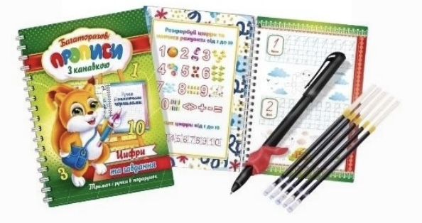 Багаторазові прописи з канавкою “Цифри та завдання” — навчальний тренажер для вивчення цифр і розвитку навичок письма. Спеціальні поглиблені лінії допомагають дитині правильно вести ручку, формувати акуратне написання цифр та готувати руку до школи.