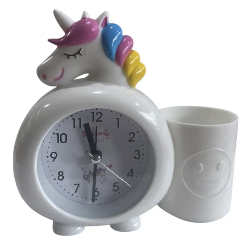 Яскравий будильник «Єдиноріг» моделі 7050 з функціональною підставкою для ручок. Ідеальний для дитячого столу: допомагає слідкувати за часом та зберігати канцелярію в одному місці.