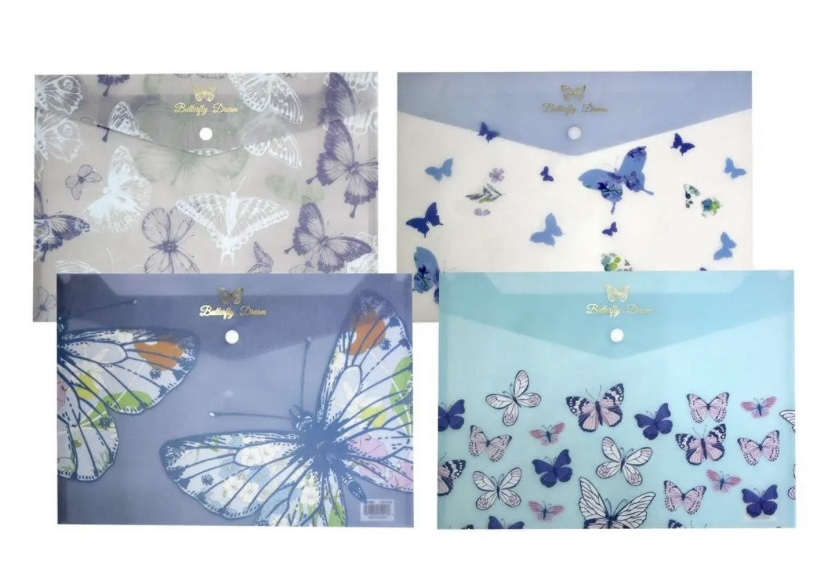 Папка-конверт на кнопці формату A4 з витонченим принтом “Бабочки”. Виготовлена з міцного матеріалу 180 мкм з текстильною фактурою, що додає виробу приємний тактильний ефект та стильний вигляд.