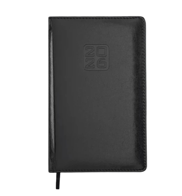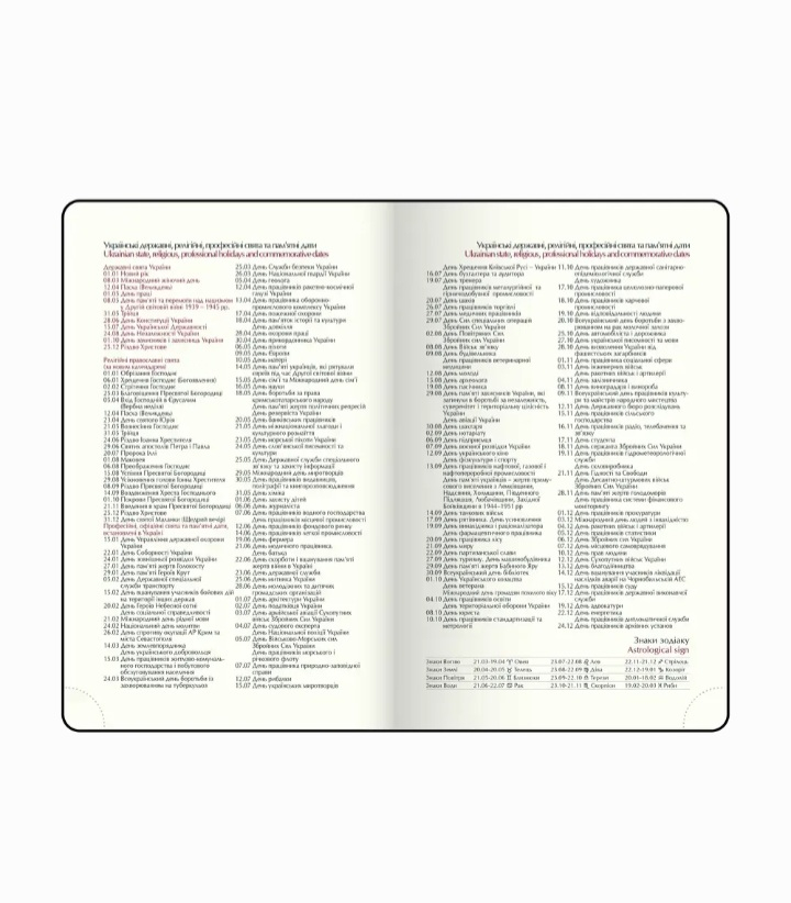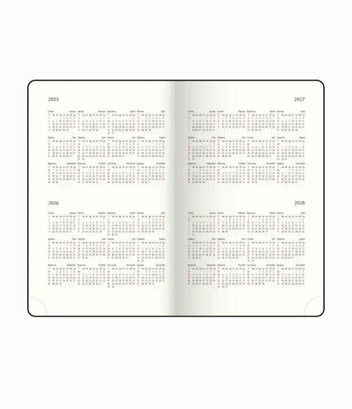 Тверда обкладинка щотижневика BRAVO виготовлена з гладкої штучної шкіри, з поролоном. На лицьовій стороні - тиснення року сліпим методом. Тонування зрізу золотом додає вишуканий акцент. Класичний та стриманий дизайн стане відмінним доповненням корпоративного стилю компанії. Формат А5 136 сторінок Внутрішній блок: офсетний папір кремового кольору щільністю 70 г/м² Закладка-лясе в колір обкладинки допоможе швидко знайти необхідну сторінку Перфоровані куточки Друк блоку в 2 кольори: сірий і бордовий Дві мови блоку: українська, англійська Мапи України та Європи на форзацах Індивідуальна упаковка: картонна коробка Структура внутрішнього блоку: Аркуш для внесення особистої інформації Календарі на 2025 - 2028 роки Планінг на 2026 рік Інформаційно-довідковий блок: національні, релігійні, професійні свята та пам'ятні дати, знаки зодіаку, телефонні коди мобільних операторів та обласних центрів України, літерні автомобільні коди країн, таблиця відстаней між обласними центрами України, довідник систем вимірювання, міжнародні знаки відповідності, знаки догляду за одягом На одній сторінці горизонтально розміщено три/чотири дні тижня (субота і неділя - вертикальне розташування на одній частині), з організатором часу від 9:00 до 18:00, вказівкою місяця, року, дня тижня та дати Алфавітна книга для внесення контактів.